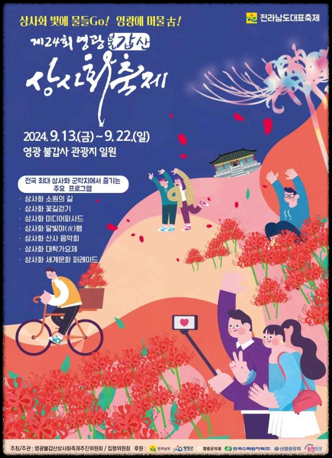 제24회 영광 불갑산 상사화축제는 올해도 상사화가 만개하는 시기에 맞춰 9월 13일부터 22일까지 열리며, '상사화 빛에 물들GO!, 영광에 머물古!'라는 주제로 다양한 프로그램이 마련되었습니다.