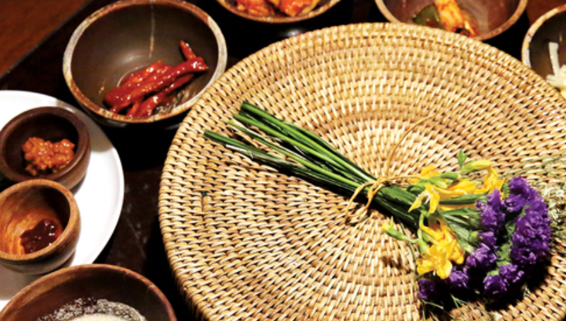 일반적으로 사찰 음식에는 오신채(마늘, 파, 달래, 부추, 홍거)를 사용하지 않지만, 산촌에서는 일반인의 입맛에 맞춰 오신채를 사용하고 있습니다.