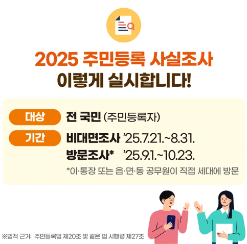 오늘의 포스팅에서는 주민등록 사실조사 비대면에 대해 안내해 드립니다. 2025년 기준 주민등록 사실조사 비대면 기간 참여방법 경품등의 정보를 안내 드립니다.