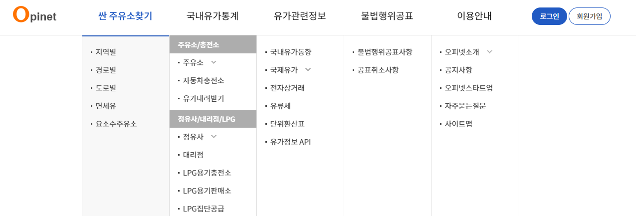 상단 메뉴바를 보시면 싼 주유소 찾기, 국내 유가 통계정보, 유가관련 각종정보, 불법행위공표등의 메뉴가 구성되어져 있습니다. 싼 주유소 찾기의 경우는 각 지역별, 경로별, 도로별, 요소수 주유소등의 정보가 구별되어져 정보를 찾으실 수 있습니다.