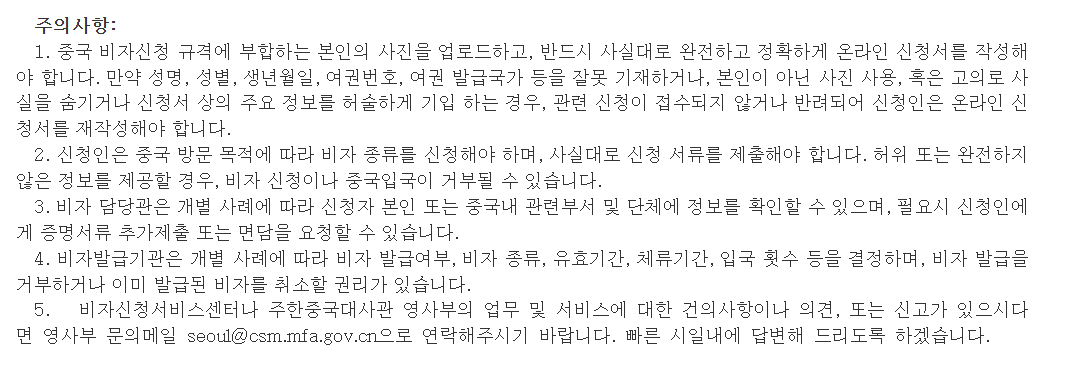 마지막으로, 구 여권에 중국 비자를 발급받은 적이 있지만 새 여권으로 비자를 신청하는 경우에는 구 여권 정보면과 구 여권에 있는 중국 비자의 사본을 제출해야 하며, 외국 여권에 기재된 성명이 이전 중국 여권 또는 중국 비자와 일치하지 않을 경우에는 정부 기관에서 발급한 개명 증명서를 추가로 제출해야 합니다.