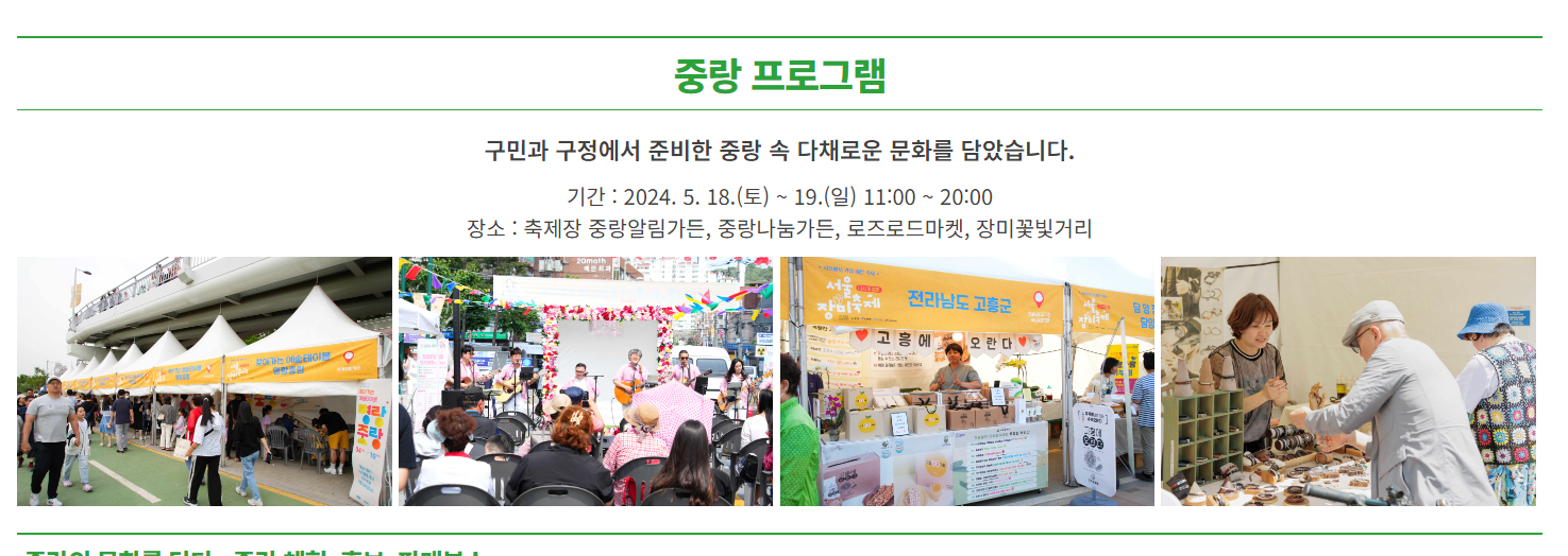 5월 25일(토)에는중랑아티스트 페스티벌, 알콩달콩 면목, 복지박람회및 푸드트럭 등 다양한 행사가 예정되어 있습니다.