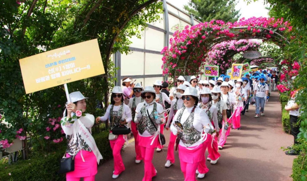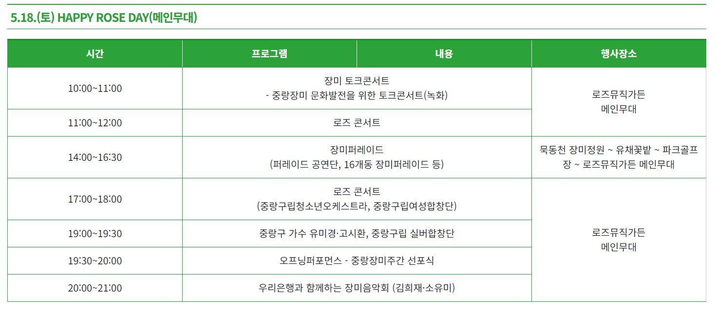 장미퍼레이드는 화려한 퍼레이드가 중랑천을 물들일 예정입니다. 중랑장미주간선포식에는 장미축제의 시작을 알리는 중요한 순간이며 저녁 시간에는 음악회가 열립니다.