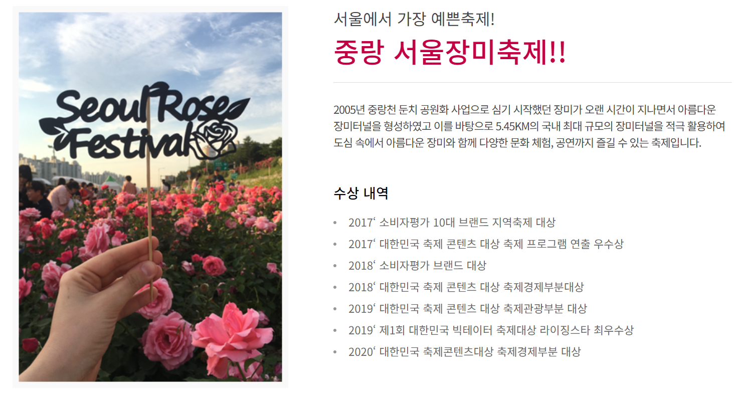 이제 지역을 대표하는 중요한 축제로 자리매김하였습니다. 2005년 중랑천 둔치를 아름답게 가꾸기 위한 노력으로 시작된 장미 심기는 시간이 흘러 5.45km에 달하는 국내 최대 규모의 장미터널을 만들어냈습니다.