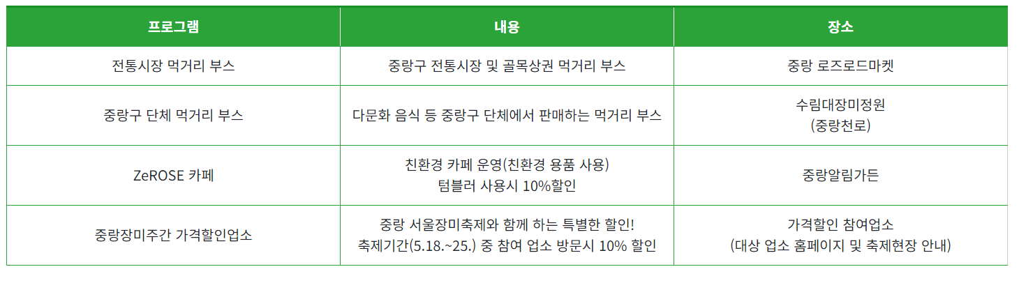 로즈템부스, 장미마켓은 장미 관련 제품을 만나볼 수 있는 마켓과 체험 부스가 운영됩니다. 전통시장 먹거리 부스, 중랑구 단체 먹거리부스에서 다양한 먹거리들이 여러분을 기다립니다.