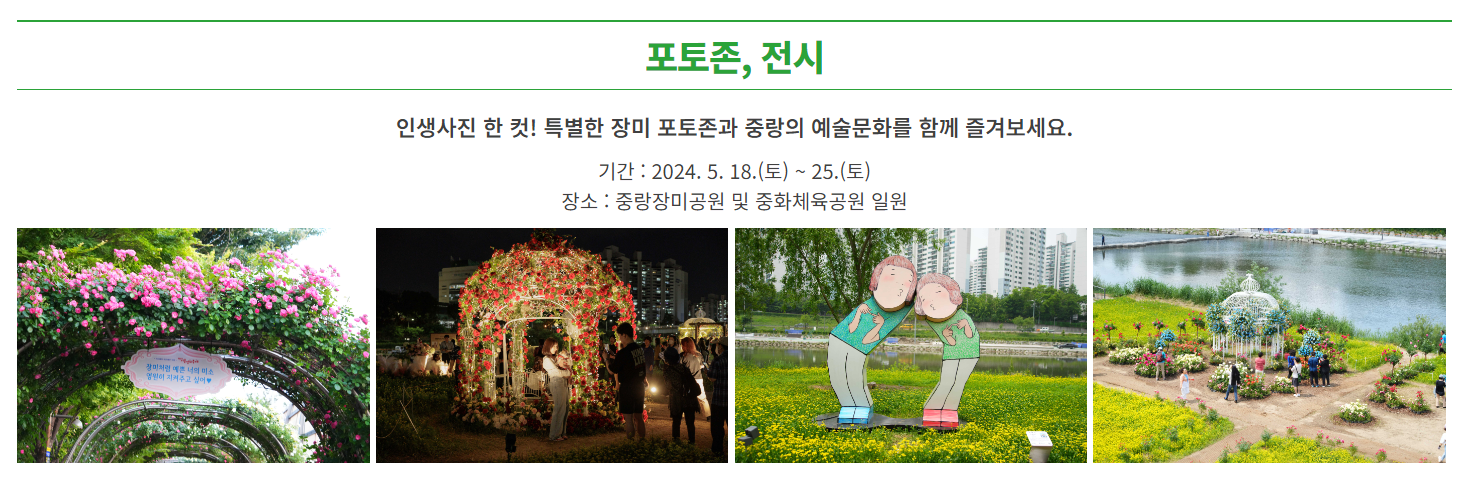이외에도 중랑아티스트 페스티벌, 알콩달콩인 면목을 비롯하여 중랑서울장미축제 걷기대회에서 건강과 함께하는 축제의 즐거움도 여러분을 기다립니다.