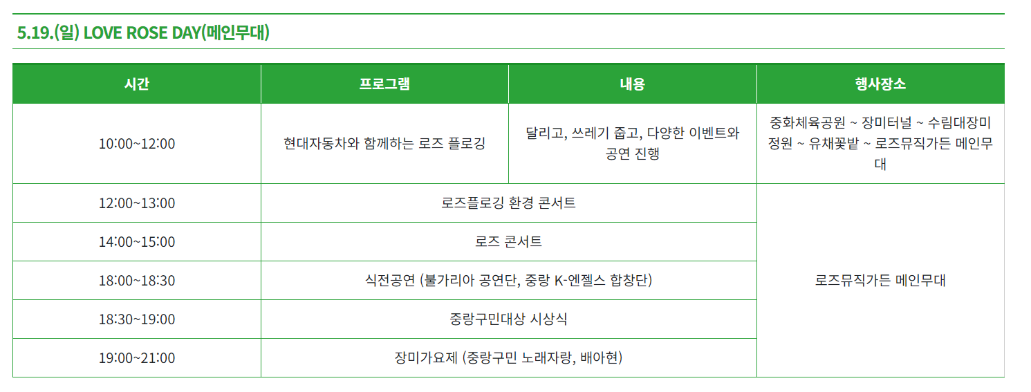 다음으로 지금부터 중랑천 장미축제 그 풍성한 일정들을 살펴보겠습니다. 먼저 메인 프로그램 그랑로즈 페스티벌 소개이며 5월18부터 19일까지 일정이 있습니다.