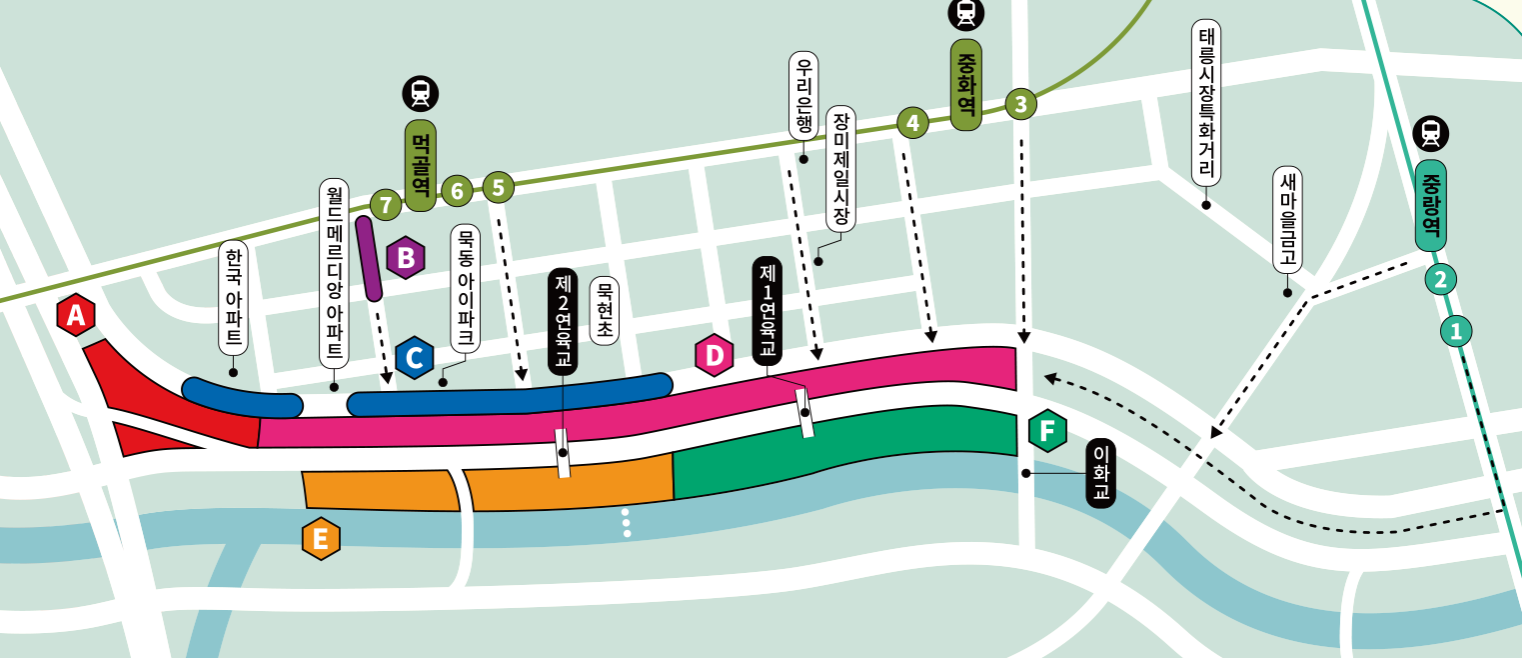 중랑천 일대는 축제 기간 동안 일부 도로가 통제되기도 하므로 차량 이동 시 교통 상황을 미리 확인하는 것이 좋습니다. 전반적으로 주차 공간이 넉넉하지 않고 혼잡하므로 대중교통 이용을 적극 권장합니다.