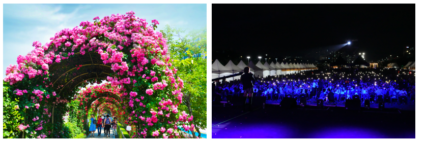 가족, 친구, 연인과 함께 장미꽃길을 걸으며 로맨틱한 분위기를 만끽할 수 있으며, 저녁에는 로맨틱 로즈 콘서트가 이어져 감미로운 음악과 함께 잊지 못할 추억을 만들 수 있습니다.