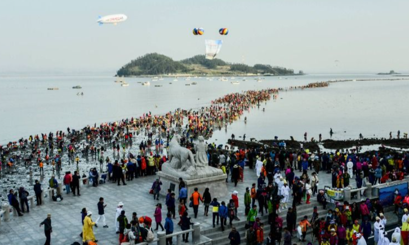 이 신비로운 현상은 음력 2월 그믐날 수심이 낮아질 때 발생하며, 30~40m 폭의 바닷길이 마치 모세의 기적처럼 펼쳐집니다. 축제 기간 동안 관광객들은 약 1시간 동안 완전히 드러난 바닷길을 걸으며 이 놀라운 경험을 직접 체험할 수 있습니다. 2025년 축제 기간 동안 바닷길이 열리는 시간은 날짜별로 다르게 설정되어 있습니다.