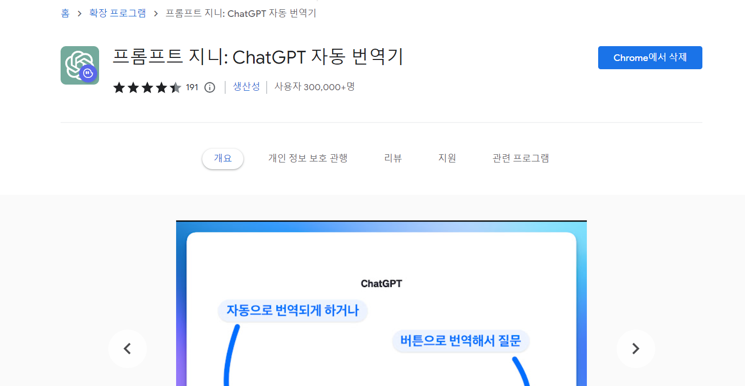 따라서 프롬프트 지니를 설치하시면 더욱 정확하고 올바른 답변을 제시합니다. 크롬을 사용하신다면 크롬 웹스토어로 이동하신 후에 프롬프트 지니를 크롬에 추가합니다. 그러면 자동으로 한국어로 입력한 결과를 영어로 번역하여 챗gpt에 질문해 주고 다시 영어로 나온 결과물을 한국어로 번역하여 주게 됩니다.