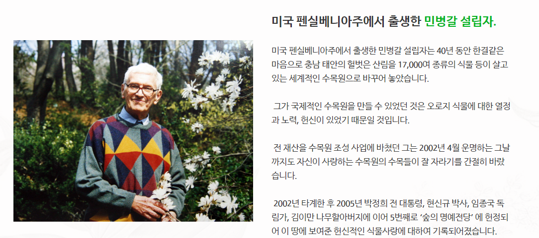 먼저 천리포 수목원에 대해 안내해 드리겠습니다. 천리포수목원은 충남 태안군 소원면에 위치한 곳입니다. 설립자는 명예전당에 헌정되고 금탑산업훈장을 수여받으신 고 민병갈님이십니다.