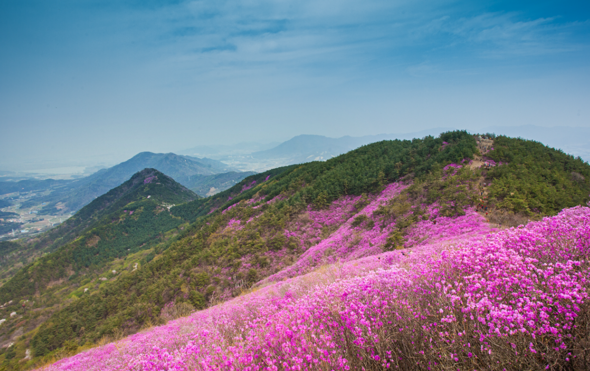 봄에는 진달래와 철쭉꽃 그리고 산이 붉게 물들면서 장관을 연출하고 있습니다. 진달래의 경우 정상인 용지봉 주변으로 군락을 이루며 피어납니다.