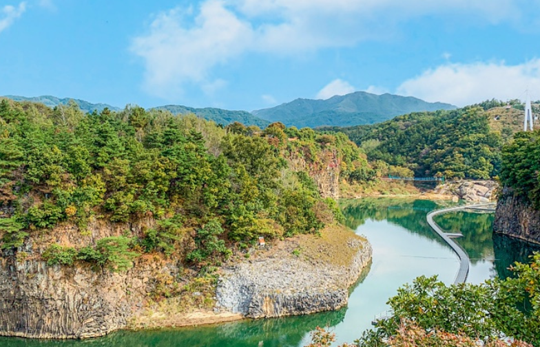 한여울 3코스는 한탄강을 가까이서 감상할 수 있는 길로, 절벽을 따라 흐르는 강물의 청량함과 기암절벽이 만들어내는 신비로운 풍경이 인상적입니다.