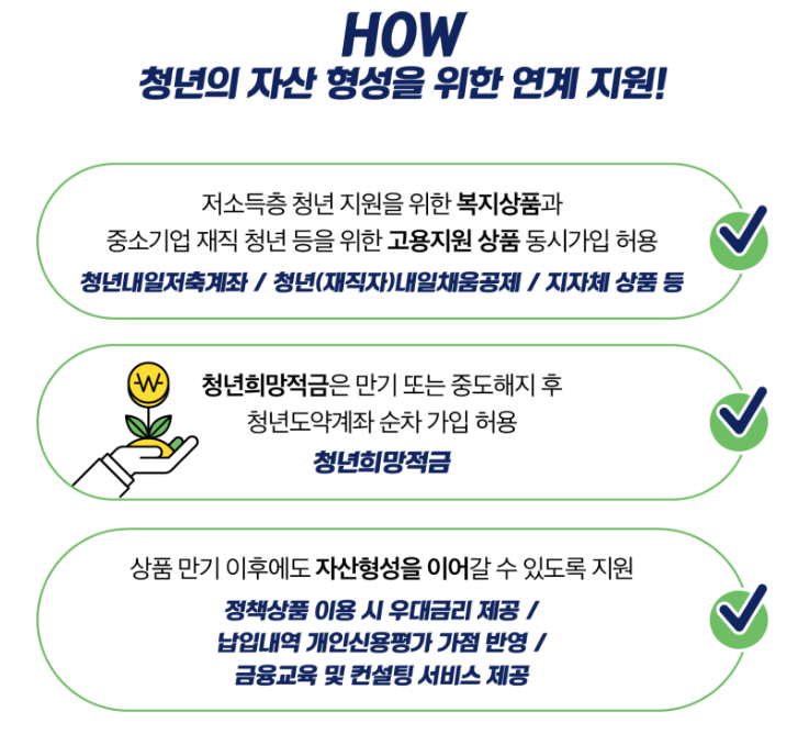 청년희망 적금은 현재는 가입할 수 없으며 청년도약계좌로 신규가입을 해야 합니다. 청년들은 생활, 주거 안정에 어려움을 겪을 수 있으며 이러한 청년의 중장기 자산형성을 도움을 주기 위하여 정부가 마련한 제도입니다. 처음의 정책은 최소 1억 정도는 모을 수 있도록 연리 3.5%로 저축해 10년 후 정도를 목표로 소득이 낮고 납입액이 많을수록 정부 지원액이 늘어나도록 설계되었습니다. 다만 현재는 처음과 지금 달라진 부분이 있습니다.