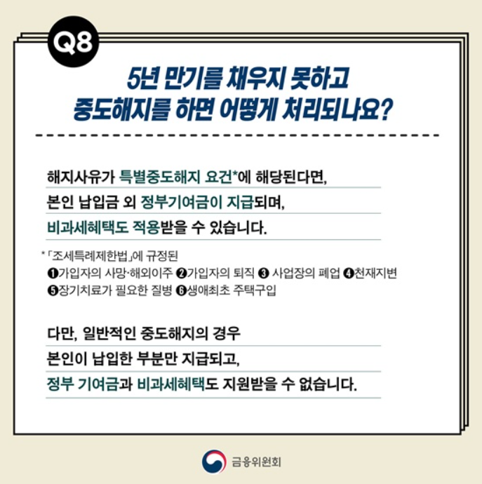 일반적인 중도해지 시에는 정부기여금과 비과세 혜택이 제외되며 본인이 납부한 금액만 지급받게 됩니다. 다만 천재지변이나 퇴직이나 폐업등 특별중도해지 요건에 해당한다면 혜택을 그대로 받으실 수 있습니다.