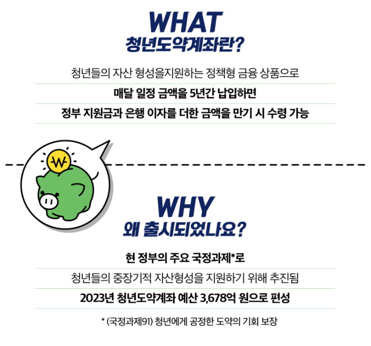 청년도약계좌란 무엇인지 기본 내용부터 살펴보도록 하겠습니다. 청년도약계좌는 2023년 예산안에 정식 도입된 제도입니다. 청년도약계좌는 윤석열 대통령의 공약이었으며 과거에 있었던 청년희망 적금은 문재인 정부에 추진되었던 것이었습니다.