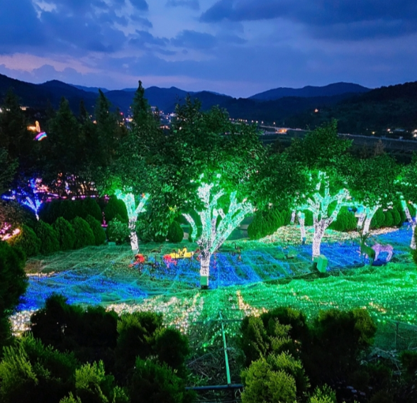 하지만 청도 프로방스의 진정한 매력은 어둠이 내린 후 시작됩니다. 낮 동안의 따뜻하고 포근한 분위기가 저녁이 되면 화려한 빛의 향연으로 바뀌며, 마치 마법 같은 공간으로 변신합니다.