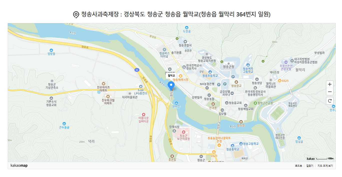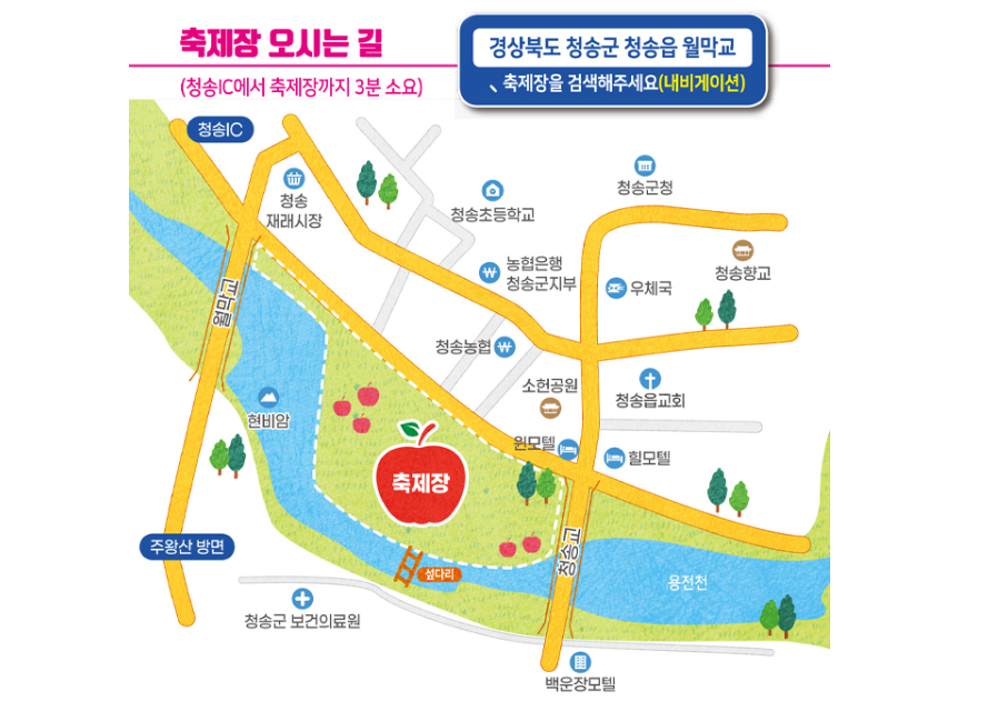 2024년도 청송사과축제가 10월 30일 수요일부터 11월 3일 일요일까지 경상북도 청송군 청송읍 용전천 현비암 일원에서 "청송사과 끝없는 비상"이라는 주제로 5일간 펼쳐집니다.