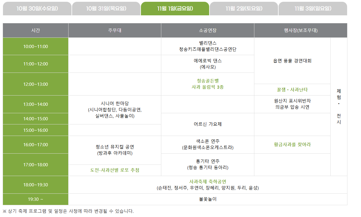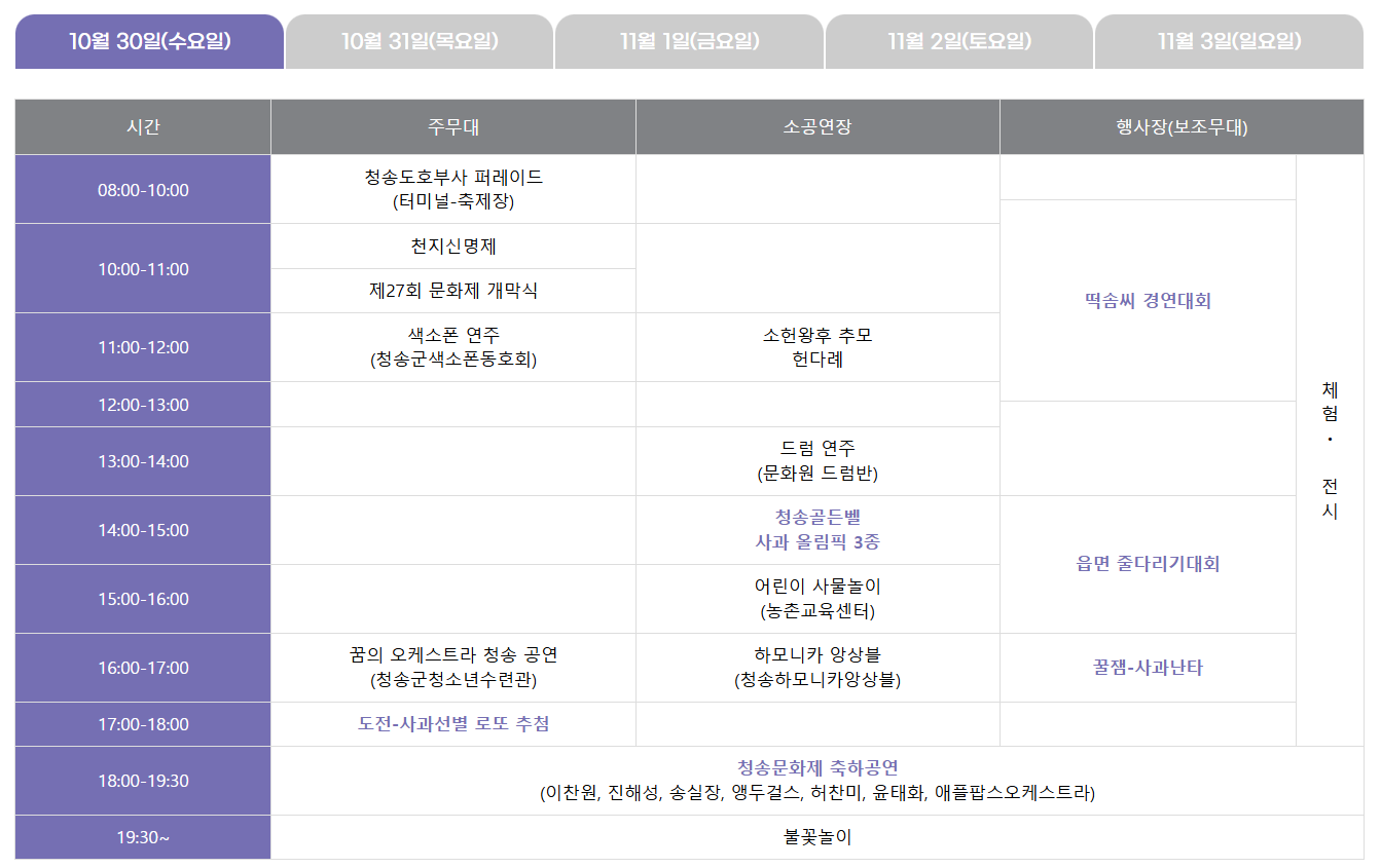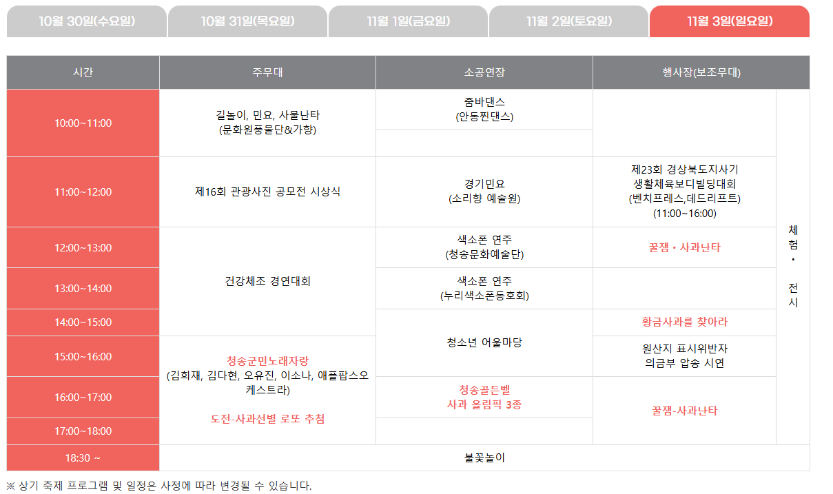 이 외에도 '청송문화제 축하공연', '사과축제공연', '청송군민 노래자랑' 등 다채로운 공연들이 준비되어 있어 축제 분위기를 한껏 고조시킬 것으로 기대됩니다.
