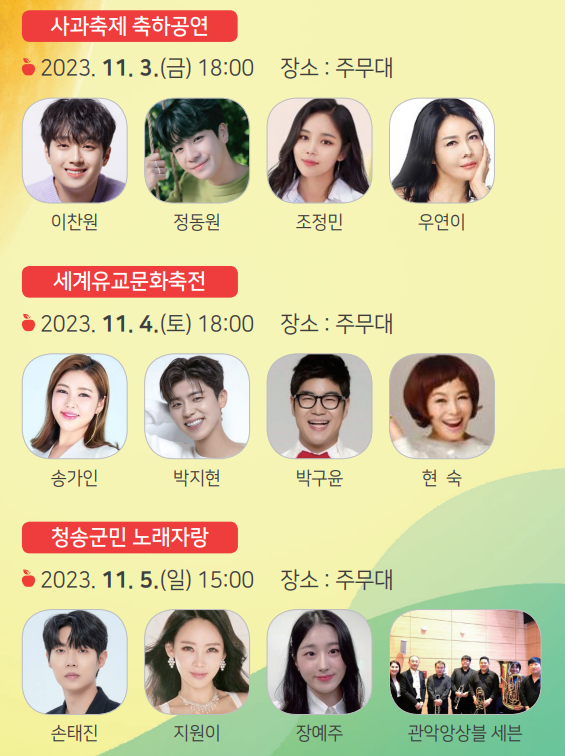 셋째날 사과축제 축하공연에는 이찬원, 정동원, 조정민, 우연이, 두리, 이소나, 태윤 가수님들이 출연할 예정입니다.