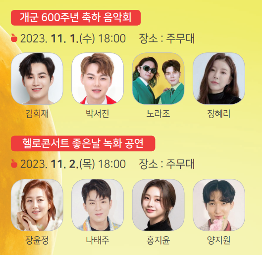 특히 개막 첫날에는 개군 600주년 축하 음악회가 18시부터 19시30분까지 예정되어 있습니다. 이날에 유명 초대가수들이 나올 예정입니다.