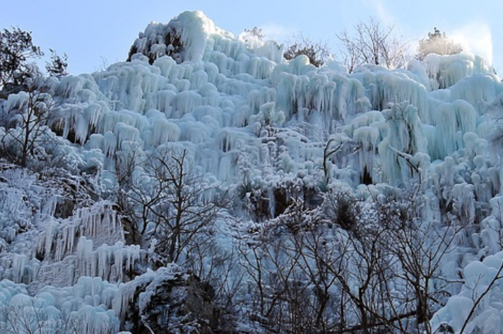겨울철이 되면 청송얼음골의 풍경은 또 다른 모습으로 변합니다. 인근에 위치한 인공폭포가 거대한 빙벽으로 변하면서 겨울 스포츠를 즐기는 사람들에게 최고의 훈련장이 됩니다.