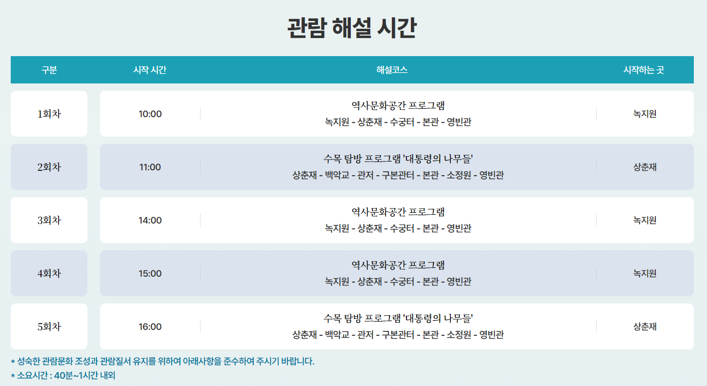기본적인 관람정보부터 살펴보겠습니다. 청와대는 보통 90분 정도면 다 둘러보실 수 있습니다. 동영상 촬영은 불가하며 사진촬영은 지정된 공간에서만 가능합니다.
