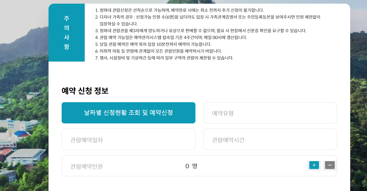 인원의 변동이나 취소의 경우가 발생하실수 있습니다. 청와대 관람의 경우 관람일 전 주 화요일까지를 기준으로 보고 있습니다.