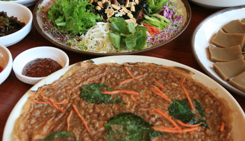 새싹 묵정식에는 묵 새싹무침, 묵빈대떡, 사발묵, 묵밥 등이 함께 나오며, 색이 아주 곱고 푸짐합니다. 보기만 해도 식감이 돋습니다.