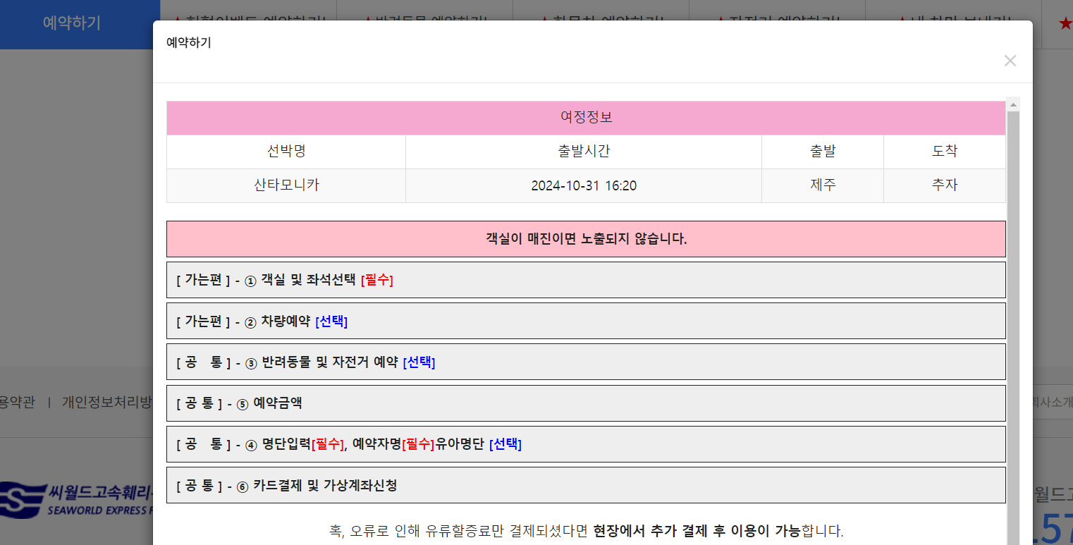 씨월드고속훼리에서 운영하며, 예매는 홈페이지 또는 전화로 가능합니다. (1577-3567)