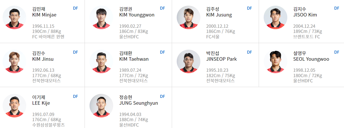 다음으로 수비수를 알아보겠습니다. 세계가 주목받는 수비수로 성장한 독일 바이에른 뮌헨의 김민재 선수가 이번 대회에서도 큰 역할을 해줄것으로 기대되고 있습니다.