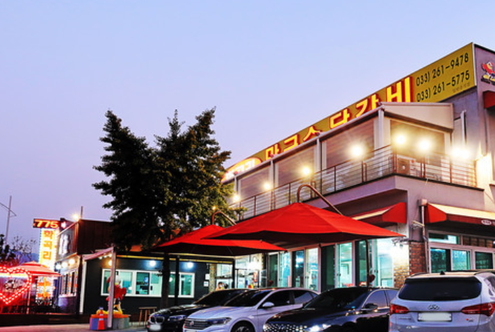 춘천 소양강댐 인근에는 닭갈비 음식점들이 줄지어 늘어서 있습니다. 그중에서도 너른 마당과 큰 건물을 자랑하는 "큰지붕닭갈비"는 눈에 띄는 곳입니다.
