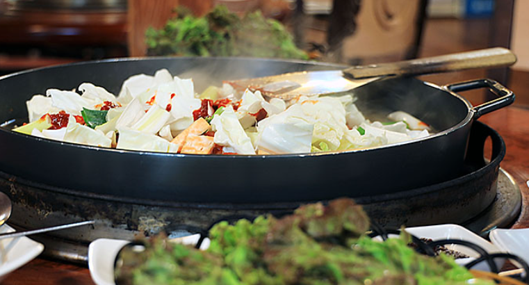 "항아리닭갈비막국수 본점"의 닭갈비는 철판 닭갈비입니다. 테이블에서 직접 익혀 먹는 방식으로, 닭갈비가 익어가는 모습을 보는 재미도 쏠쏠합니다.