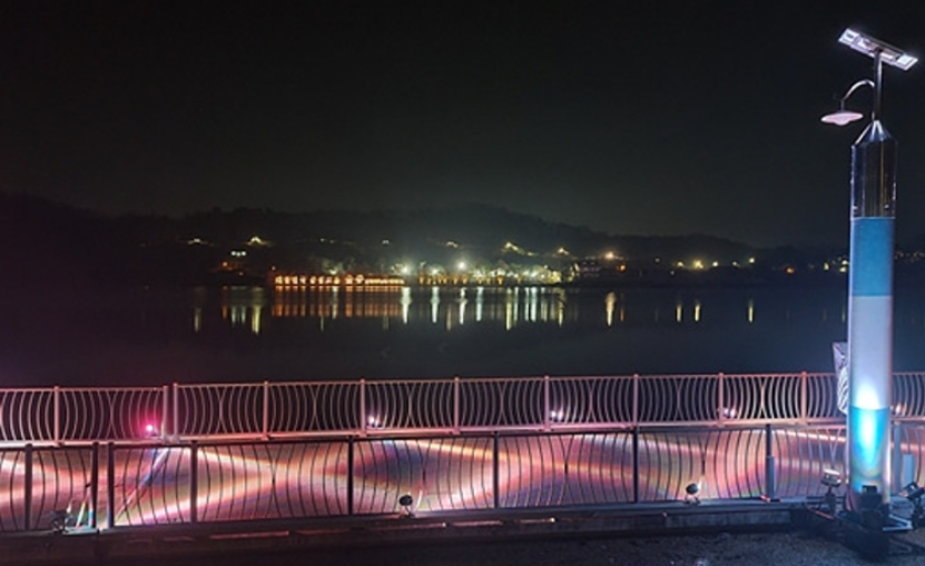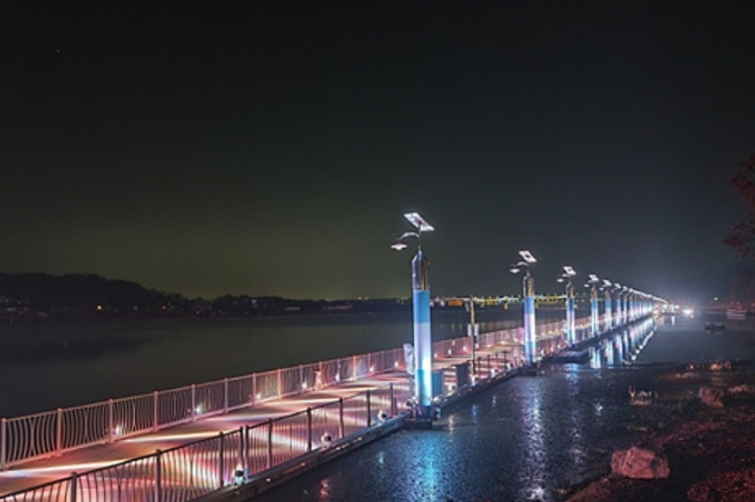 호수를 따라 설치된 다양한 색상의 조명이 밤하늘과 호수에 반사되어 환상적인 분위기를 연출합니다. 이 조명은 주기적으로 색상이 변해 걷는 내내 다양한 색감을 즐길 수 있습니다.