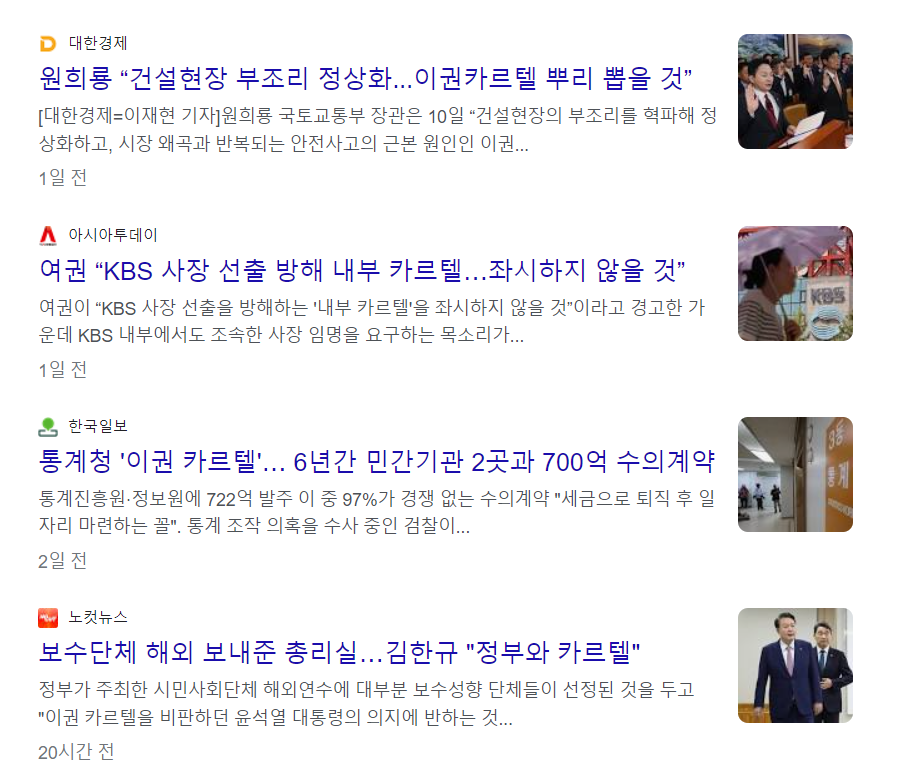 사교육 이권 카르텔이라는 단어를 정부가 직접 만들어서 사용을 한 사례입니다. 최근 발생한 철근 누락 아파트 사고관련하여 원희룡 장관은 근본 원인인 이권 카르텔을 뿌리 뽑는 데 앞장서겠다고 밝히면서 카르텔을 언급하였습니다.