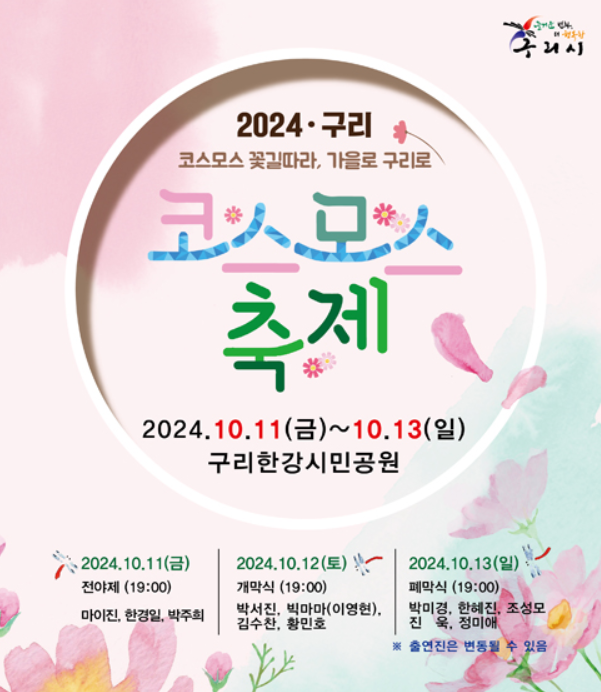 경기도 구리시에서 매년 가을 열리는 구리 코스모스 축제는 지역 주민과 수도권 방문객들에게 사랑받는 가을 행사입니다. 축제는 구리 한강 시민 공원에서 펼쳐지며, 공원 전체를 아름답게 수놓는 코스모스 꽃밭을 중심으로 다양한 프로그램과 이벤트가 진행됩니다.