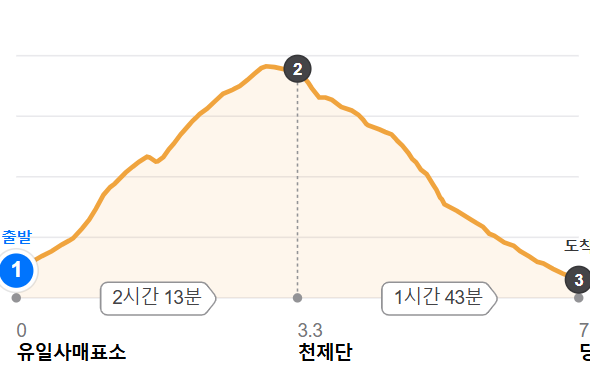 최대 고도는 1557m로 유일사 코스와 비슷하지만, 경로가 조금 더 길고 주요 지점을 지나가는 만큼 체력 소모가 더 많습니다.