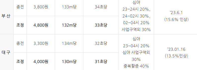 대구의 경우 이미 4천원으로 기본 요금이 오른바 있습니다. 23시부터 할증이 적용되어 새벽4시까지 20%의 할증이 붙습니다.