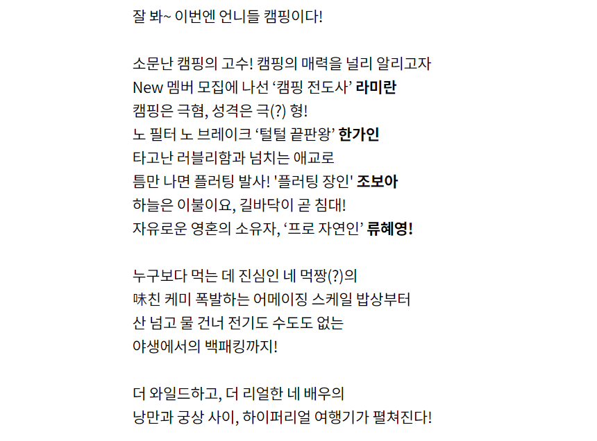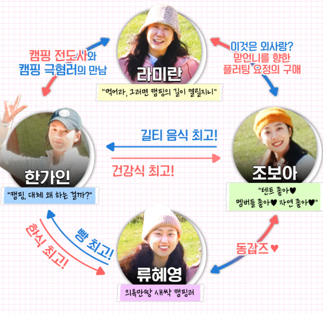 특히 배우 라이란은 연예계에서도 소문난 캠핑 매니아이며 그녀를 중심으로 멤버들간의 케미가 상당히 뛰어나다는 반응을 얻고 있습니다.