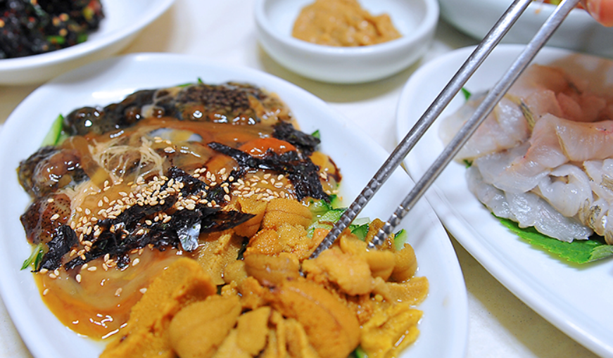 생선회를 비롯해 가자미찜, 멸치회무침, 복어껍질 무침, 해삼, 멍게, 전복, 한치 등의 해산물 회, 생선구이, 초밥 등의 요리가 한 상 가득 차려집니다. 경상남도 통영시 운하1길 46에 위치합니다.