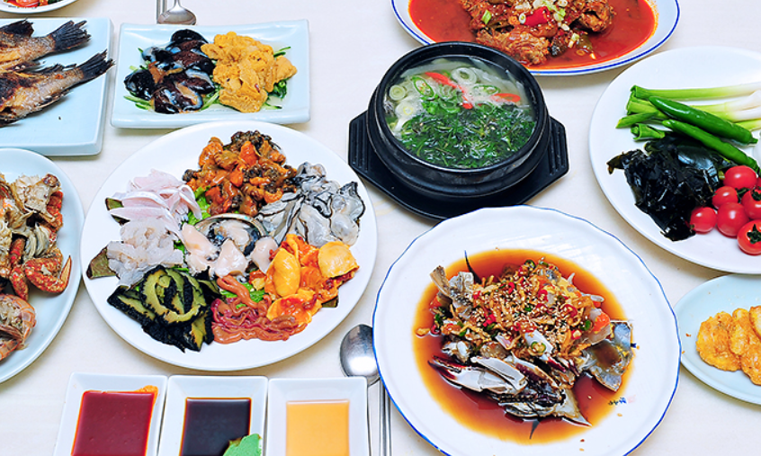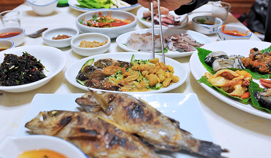 이어서 생선회, 생선구이, 간장게장, 석화구이, 멍게, 해삼, 전복, 굴찜 등 제철 해산물 요리가 끝없이 이어집니다.