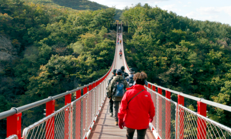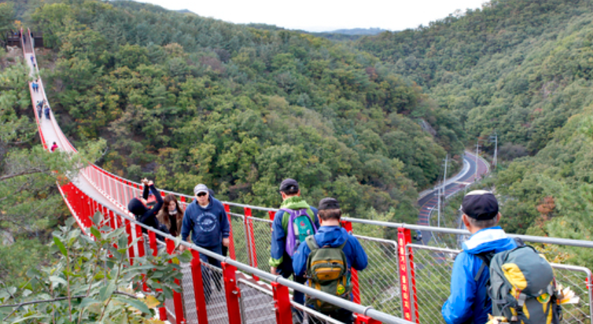 다리 중간중간에는 투명 강화유리가 설치되어 있어 발아래 펼쳐진 계곡과 숲을 내려다보는 짜릿함을 더합니다.