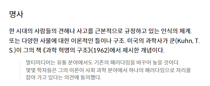 패러다임은 paradigm이라고 표기가 됩니다. 이 단어의 유래는 고대 그리스어에서 시작했습니다. 본래는 동사의 변화 패턴을 외우는 데 쓰는 범례로서 활용이 되다가 과학 혁명의 구조를 발표한 쿤에 의하여 관습법상의 판례에 준거해 판결을 내리는 것을 과학 활동과 비유하여 사용되기 시작을 하면서 현대적 의미가 되었습니다.
