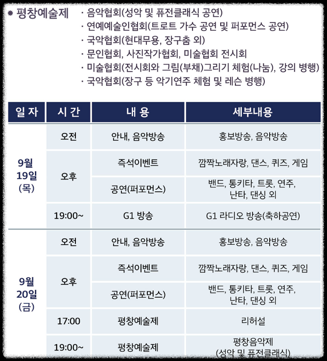 문화예술 공연, 백일장 및 사생대회, 삼행시 짓기 대회, 대통합 아라리, 한가위 노래자랑 등 다채로운 공연과 행사도 준비되어 있어 관광객들의 눈과 귀를 즐겁게 할 예정입니다.