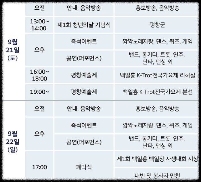 13일부터 16일까지는 용평면 장평리 전통민속상설공연장에서 2024 평창 농악축제가 개최됩니다. 따라서 다양한 축제와 방문 계획 일정을 잘 계획하셔서 즐거운 시간을 보내시기에 매우 좋습니다.