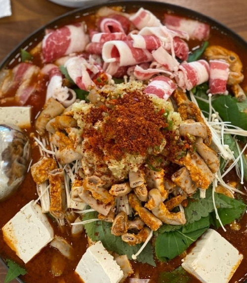 포항곱창전골 효자동곱닭의 대표 메뉴는 우삼겹곱창전골입니다. 푸짐한 곱창과 우삼겹, 다양한 채소가 어우러져 깊고 진한 국물 맛을 자랑합니다.