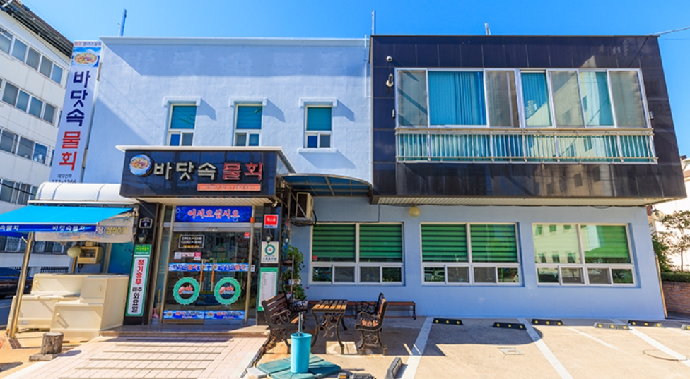 다음은 현지인 강력추천하는 물회 맛집, 바닷속물회입니다. 깔끔한 외관과 예스러운 분위기의 인테리어가 돋보이는 이곳은 다양한 종류의 물회와 해산물 요리를 즐길 수 있는 곳입니다.