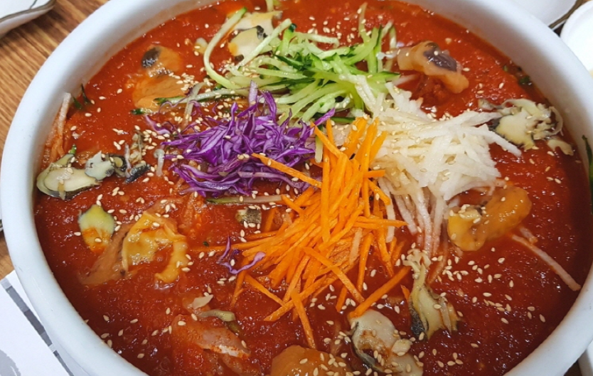 이곳의 대표 메뉴는 바로 살얼음이 떠 있는 매콤한 고추장 양념에 신선한 회와 아삭한 야채를 듬뿍 넣어 비벼 먹는 '물회 국수'입니다. 쫄깃한 국수사리까지 더해지면 그 맛은 정말 말로 표현할 수 없을 정도입니다.