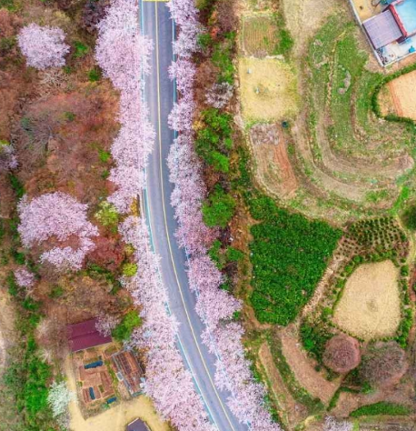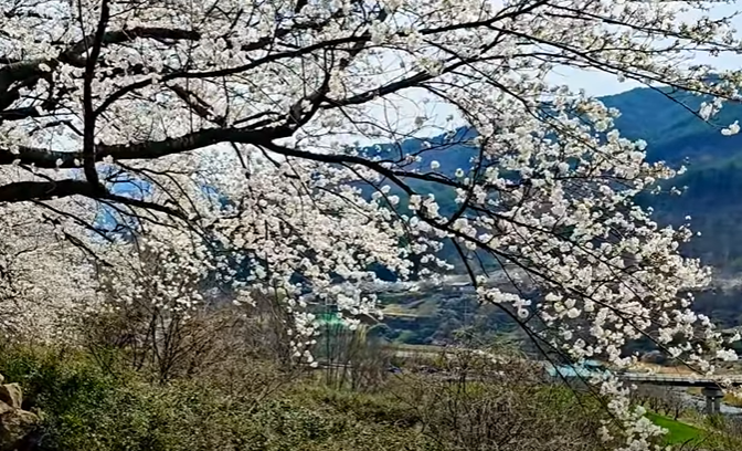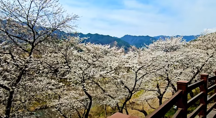 이곳에는 연분홍빛 왕벚나무와 짙은 분홍빛의 산벚나무가 함께 어우러져 더욱 다채로운 색감을 선사하며, 보는 이들로 하여금 자연의 경이로움을 만끽하게 합니다.